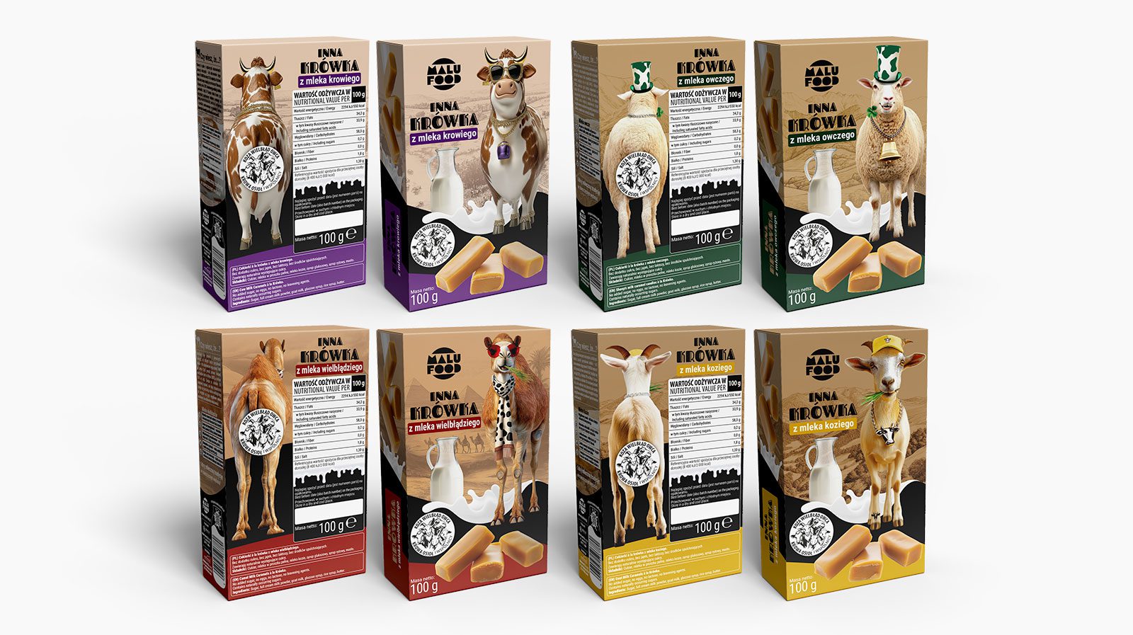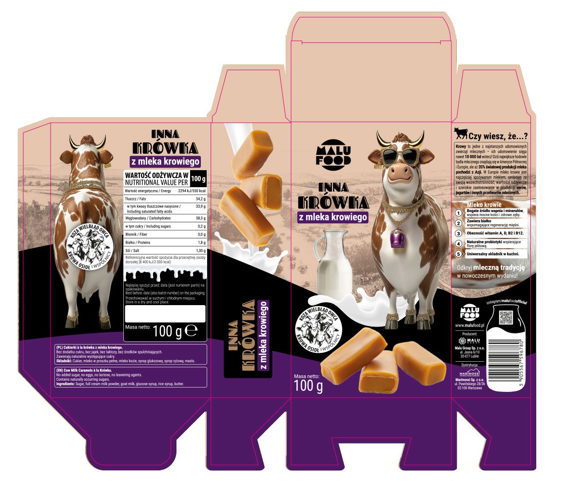 Front pudełka to scena z bohaterem–zwierzęciem, logotypem INNA KRÓWKA, wyraźną informacją „z mleka…” oraz apetycznymi karmelkami. Tło i kolor dolnego pasa różnicują rodzaj mleka, dzięki czemu konsument intuicyjnie odczytuje wariant, nawet z większej odległości.