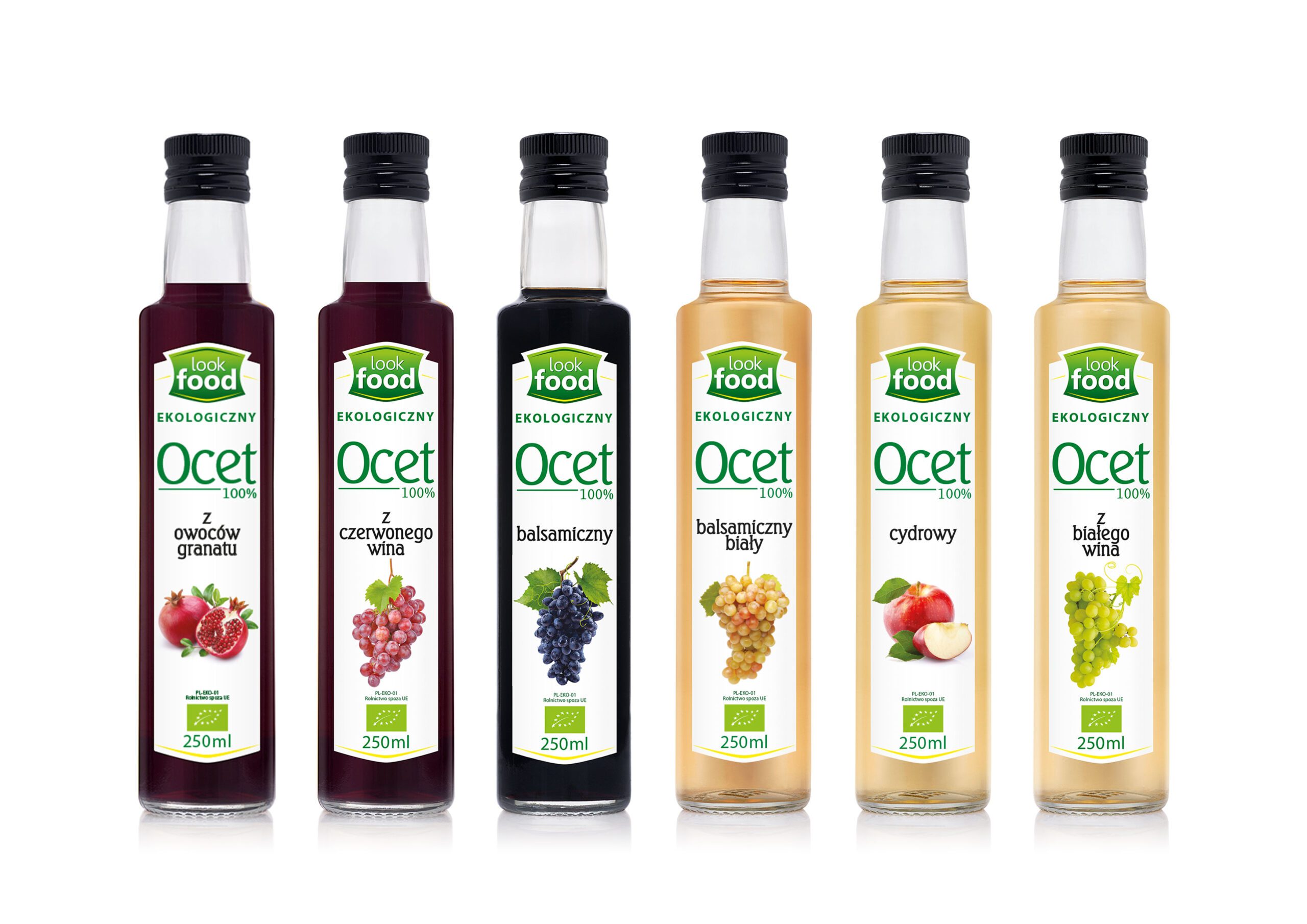 Po odświeżeniu znaku zacząłem budować powtarzalny szkielet etykiet dla całej marki. Oparłem go na herbie Look Food, czytelnej hierarchii i uporządkowanej typografii, aby różne kategorie mogły mówić jednym językiem. Kluczowy żółty akcent — obecny już wcześniej w logo — celowo „wyprowadziłem” na zewnątrz, by stał się rozpoznawalnym sygnałem systemu i fundamentem charakterystycznego wykrojnika etykiet. Dzięki temu spójność była widoczna od pierwszego kontaktu z produktem, niezależnie od formatu opakowania.