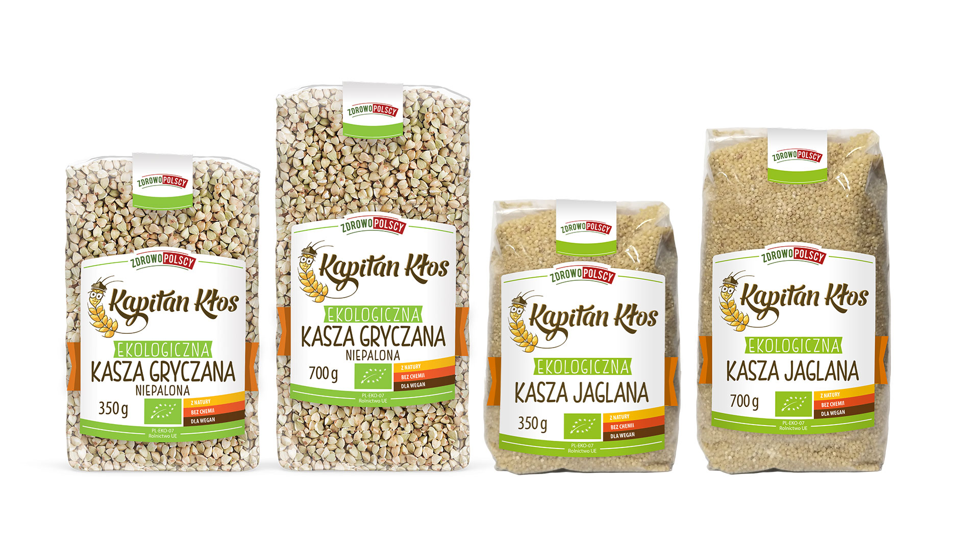 Dla produktów bazowych Kapitan Kłos (np. kasza gryczana, jaglana – 350 g i 700 g) zaprojektowałem etykiety oparte na mocnym kodzie kategorii: pomarańcz buduje wyraźny, spójny blok na półce, a stała siatka projektu porządkuje komunikację. Klient od razu widzi markę, rodzaj produktu i wagę – bez szukania drobnym drukiem. Dzięki temu różne odmiany i formaty wyglądają jak jedna rodzina, a jednocześnie pozostają łatwe do odróżnienia w codziennych zakupach.