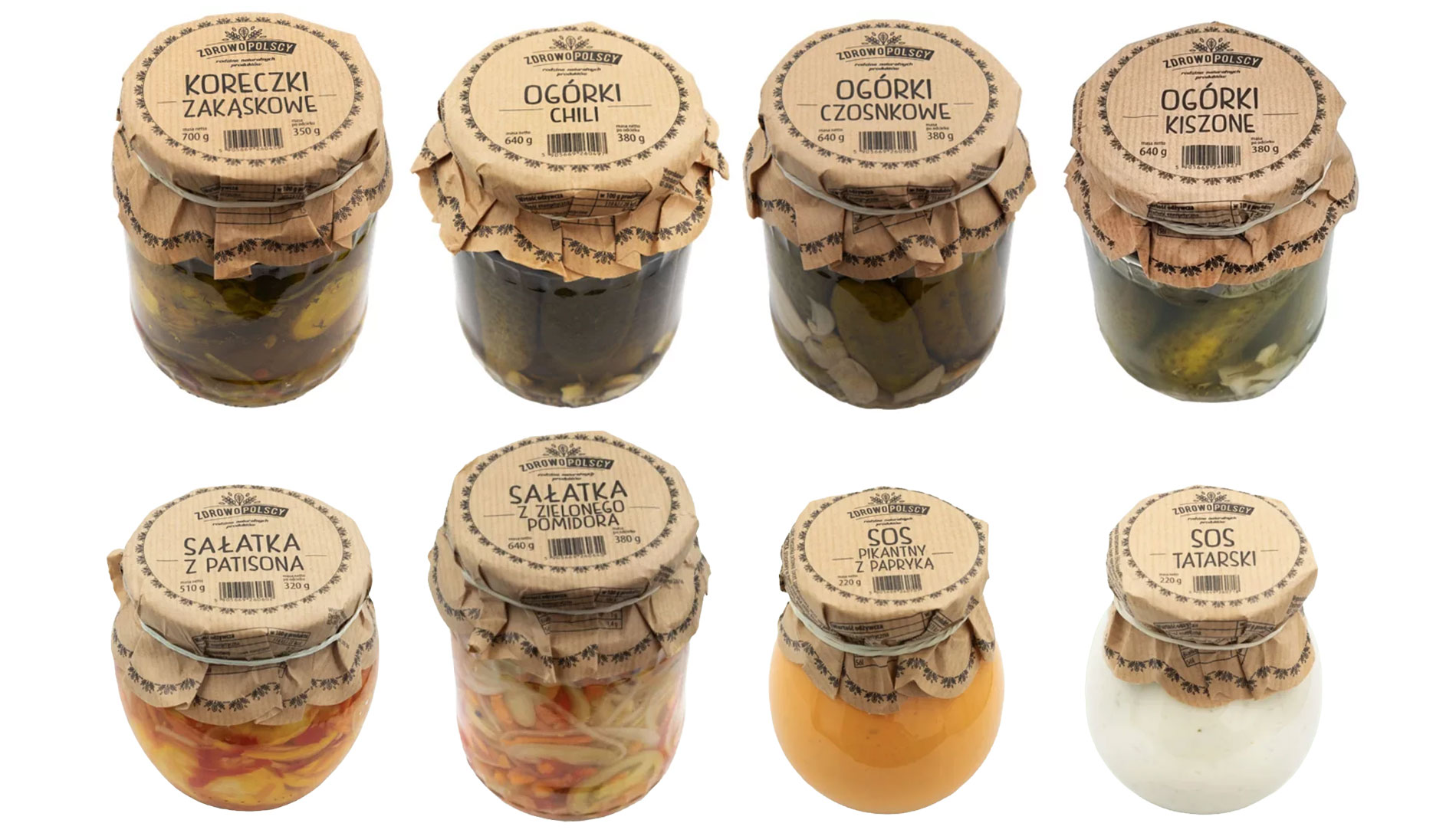 Dla linii przetworów w słoikach przygotowałem osobny, bardziej „spiżarniany” język wizualny, który buduje wiarygodność i naturalny charakter marki. Kraftowa osłona wieczka, prosta typografia i powtarzalny detal roślinny tworzą rozpoznawalny szablon, a czytelny układ (marka → nazwa produktu → wariant) pozwala szybko odnaleźć konkretny smak, np. ogórki chili/czosnkowe/kiszone, sałatki czy sosy. Pokazane realizacje to przykłady – system został zaprojektowany tak, aby można było łatwo dopinać kolejne produkty i warianty bez zmiany stylistyki, zachowując spójność całej linii.