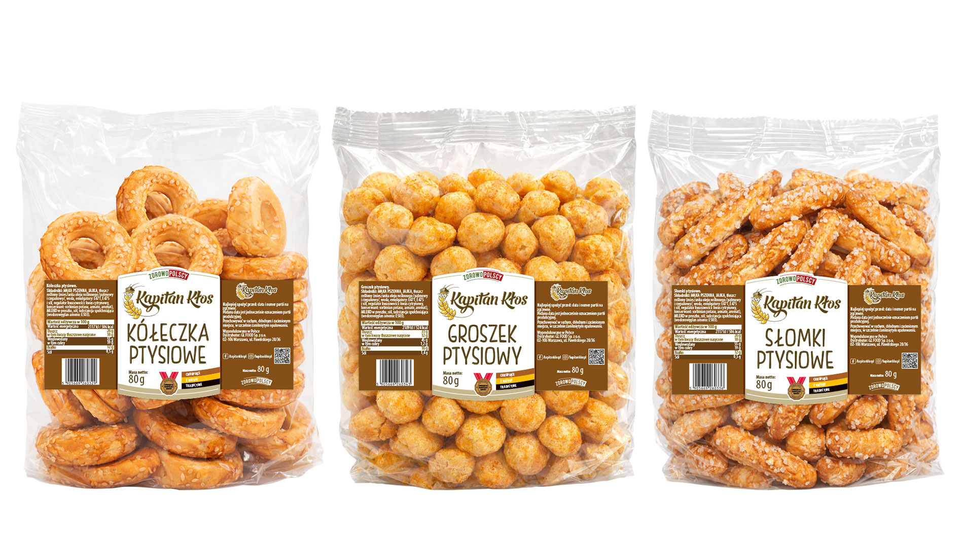 Dla przekąsek ptysiowych zaprojektowałem etykiety tak, aby mimo różnych kształtów produktu (kółeczka, groszek, słomki) seria była od razu rozpoznawalna jako jedna linia. Wspólny, brązowy blok kategorii porządkuje półkę i buduje „snackowy” charakter, a stała siatka frontu utrzymuje tę samą hierarchię informacji (marka → nazwa → forma → gramatura). Dzięki temu klient szybko wybiera ulubiony wariant, a marka może łatwo dopinać kolejne formy lub smaki bez zmiany całego systemu.