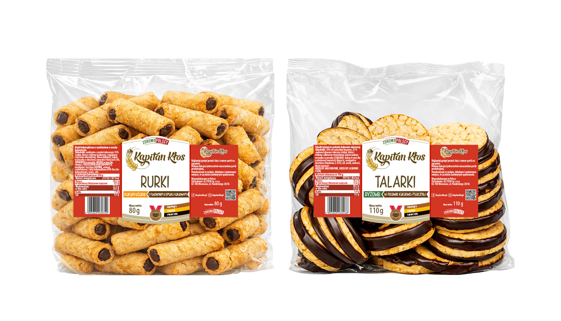 Dla słodkich przekąsek Kapitan Kłos (m.in. rurki i talarki w czekoladzie) przygotowałem etykiety w spójnym układzie, gdzie kluczowe informacje zawsze są w tych samych miejscach (marka → nazwa → forma/rodzaj → gramatura). Ta linia dostaje własny, mocny charakter dzięki czerwonemu blokowi kategorii, który od razu odcina ją od produktów bazowych i śniadaniowych. Dzięki temu mimo różnych kształtów i opakowań seria wygląda jak jedna rodzina, a klient szybko rozpoznaje, że to „słodka przekąska” i wybiera konkretny wariant bez wczytywania się w drobny tekst.